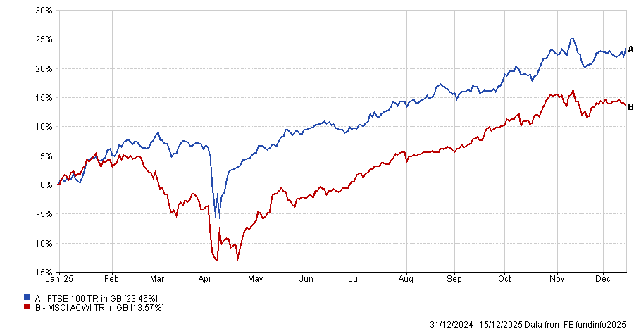 The FTSE 100 (the main index of the largest companies on the London Stock Exchange) has had its best year since around 2009, delivering a total return of about 23.5% in 2025, which is much better than the global stock market average. UK shares have beaten big markets like the US and Japan this year, helped by strong company profits and generous cash returns (dividends) to shareholders. Analysts expect FTSE 100 companies’ profits to hit a record of just under £229bn in 2025 and rise another 14% to about £260bn in 2026. The index is no longer “dirt cheap” after the strong run. It trades at around 13.5 times expected 2026 earnings, which is roughly in line with its historical average, so it is described as “not expensive, but not ragingly cheap either”.